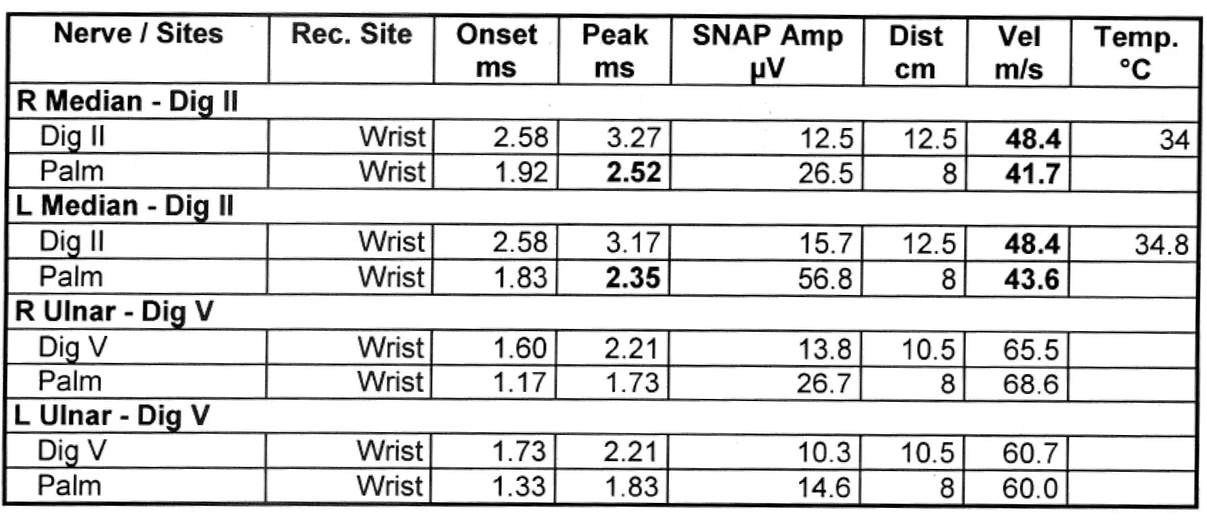 Nerve study showing carpal tunnel syndrome. The abnormal results are in bold. Compared to the normal ulnar nerves, the velocity (nerve conductions speed) is slower and the amplitudes are lower (showing fewer nerve fibers firing). Overall, this patient had moderate carpal tunnel syndrome and improved after surgery.