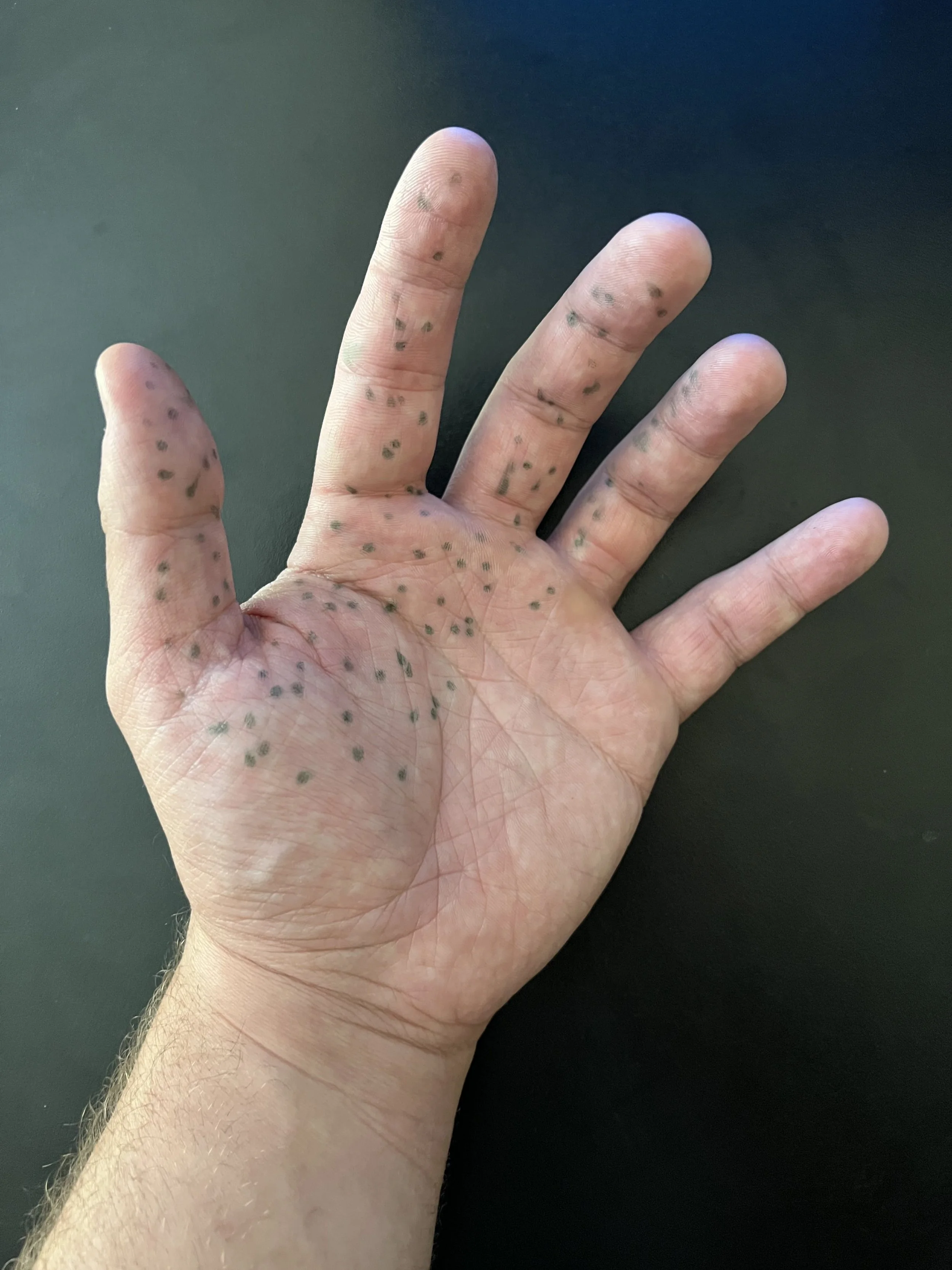 Numbness in carpal tunnel syndrome. The dots were drawn according to where the patient felt numbness and tingling. Note that the thumb, index, middle, and half of the ring finger are involved.